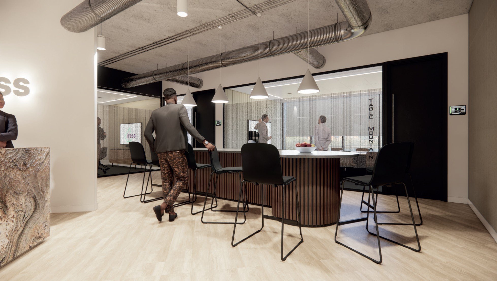 The completed workplace delivers a confident and welcoming front of house experience, including a meeting suite positioned to take full advantage of views toward Table Mountain. Behind the secure threshold, staff benefit from a balanced environment that supports collaboration, focus, and culture.