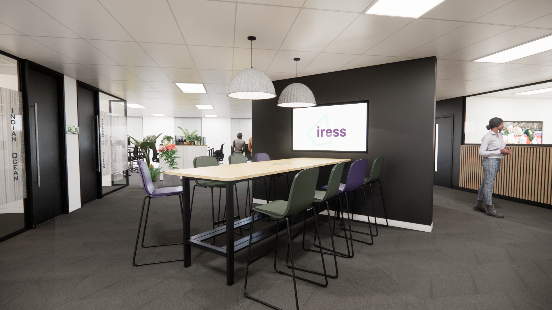 Iress required a workplace that reflected its global identity while supporting a growing team in Cape Town. The office needed to balance client experience, operational security, and everyday usability, with clear distinction between public and private zones.